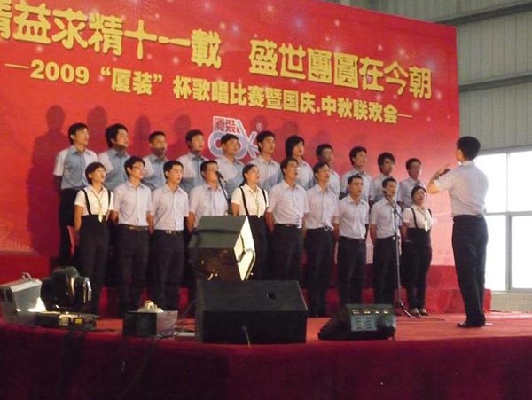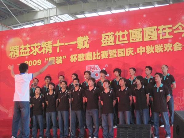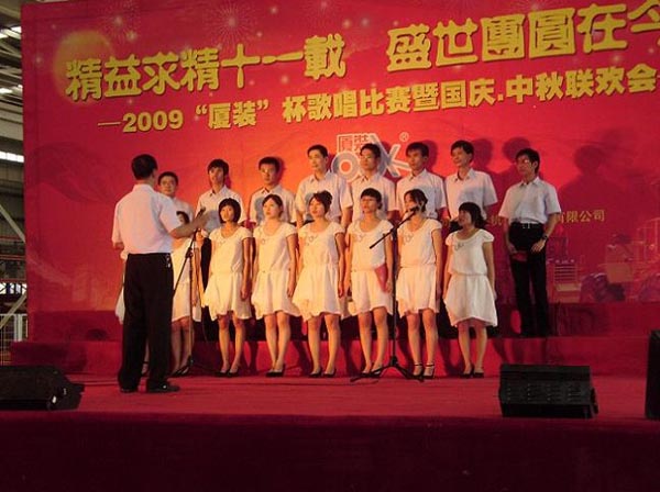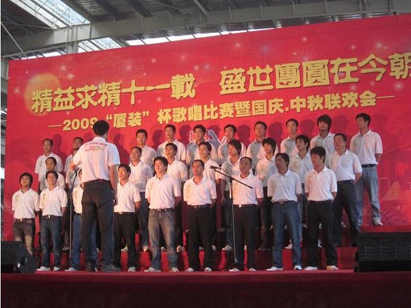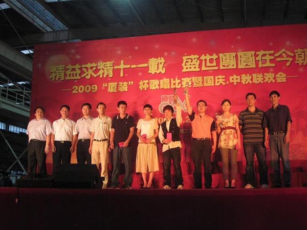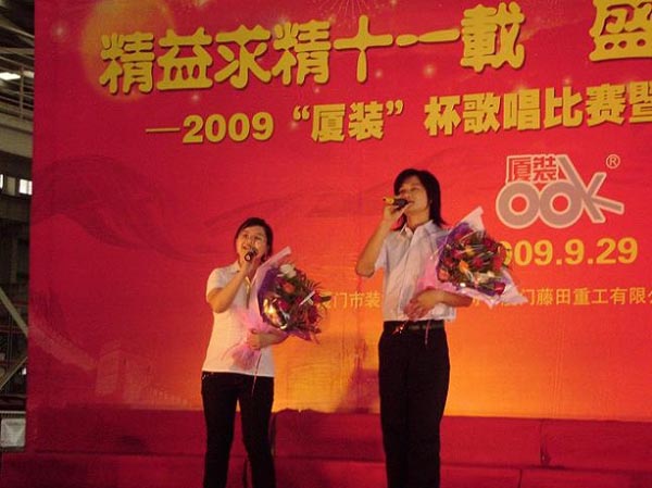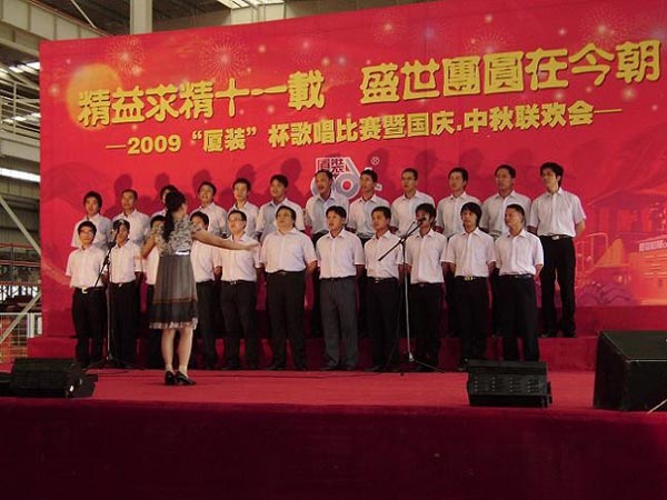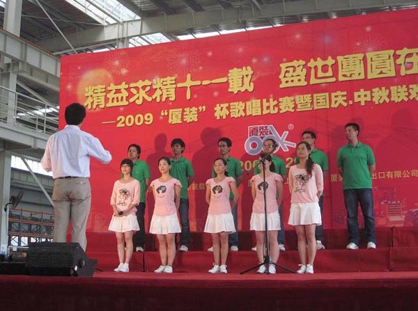 9月29日下午,2009年度“廈裝杯”歌唱比賽在廈裝公司總裝車間舉行。此次歌唱比賽以“精益求精十一載、盛世團圓在今朝”為主題,賀祖國60周年華誕、喜迎中秋、慶祝廈裝成立11周年。公司及各部門從6月份開始籌備此次比賽,此次比賽分為集體組和個人組,集體組(合唱)以部門為單位,最終有6支隊進(jìn)入當(dāng)天的決賽,個人組通過先前的部門推薦及預(yù)賽選拔,最終有11人闖入決賽。